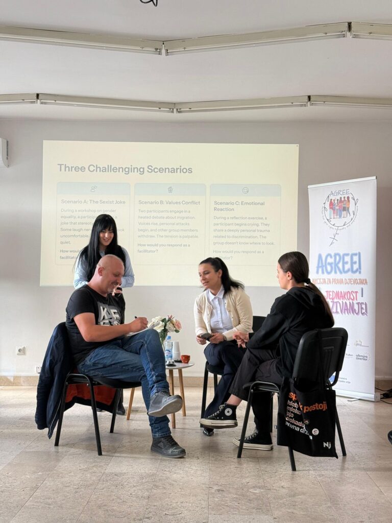 As part of the regional project “AGREE! – Action for Girls’ Rights to Equality and Empowerment!”, co-funded by the European Union, representatives from Woman to Woman (Gruaja tek Gruaja) actively participated in four regional capacity-building trainings held in Tuzla (Bosnia and Herzegovina) and Skopje (North Macedonia) during 2025.